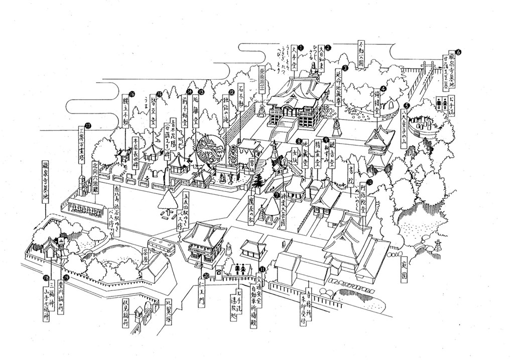 境内にはお堂や独鈷の滝のほか、多くの仏様がおまつりされています。徳川幕府の歴代将軍が参詣に訪れたという江戸時代の堂塔伽藍は『目黒御殿』と呼ばれ、江戸随一の名所として親しまれていました。惜しくも戦災によりほとんどの建物が焼失してしまいましたが、昭和56年(1981)、大本堂が再建され、国内外を問わず多くの参詣者が集う東京の名所として親しまれています。