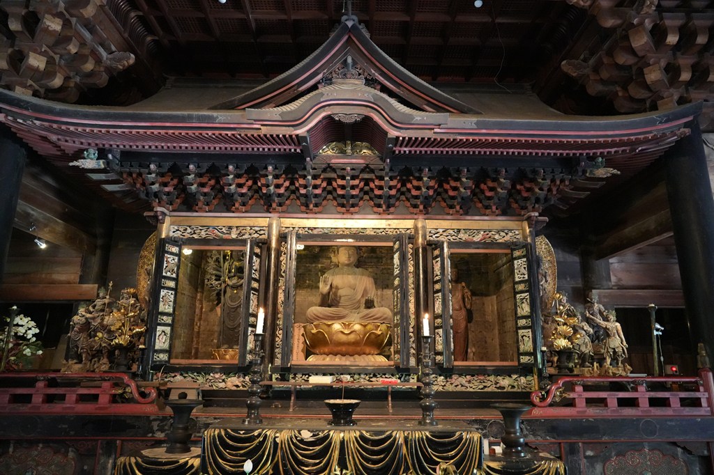 本堂内の厨子の内部には、3躯の仏様がおまつりされている。中央にご本尊である木造薬師如来坐像、向かって右側に木造聖観音立像、向かって左側に木造千手観音立像がおまつりされている。江戸時代の本堂建立当初は、聖観音菩薩立像の位置に毘沙門天立像がおまつりされていた。 ご本尊様は、半丈六(約1.4メートル)の坐像で、藤原期に造立されたと考えられている仏様。 両脇にまつられている木造聖観音菩薩立像と木造千手観音立像は、もともと境内の諸堂の本尊であったと考えられている仏様。千手観音立像は現在の本堂が建立された際、聖観音様はもともと厨子内におまつりされていた毘沙門天立像が収蔵庫へ移された際に本堂へ移されたという。 通常は厨子の扉は閉められているが、毎年2月11日に御開帳されている。