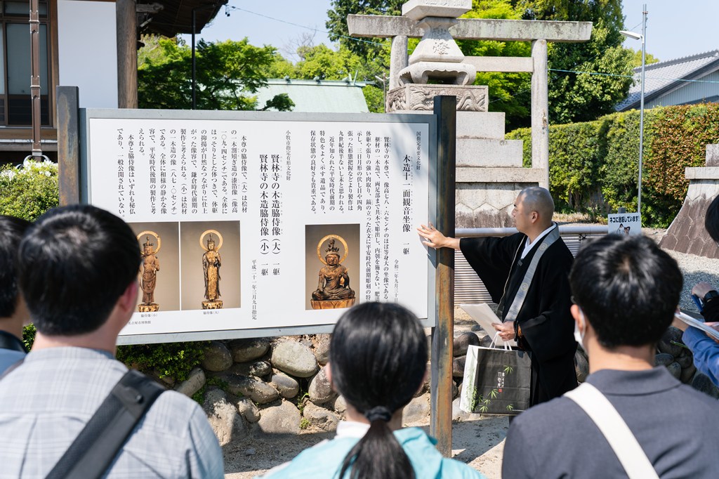 賢林寺の秘仏御本尊・十一面観音菩薩坐像は、一木造で、カヤとみられる針葉樹材を使用して造立された仏様。髪が渦を巻いて耳にかかる表現は、平安時代の9世紀~10世紀の彫刻にみられる表現であり、さらに球体状の頭部や鎬立つ衣文が見られることから、平安時代前期・9世紀後半の造像であると考えられている。全国的に見ても十一面観音さまを坐像であらわした像は少ないことに加え、当初の漆箔が多く残る点が貴重であることから、令和2年に国の重要文化財に指定された。