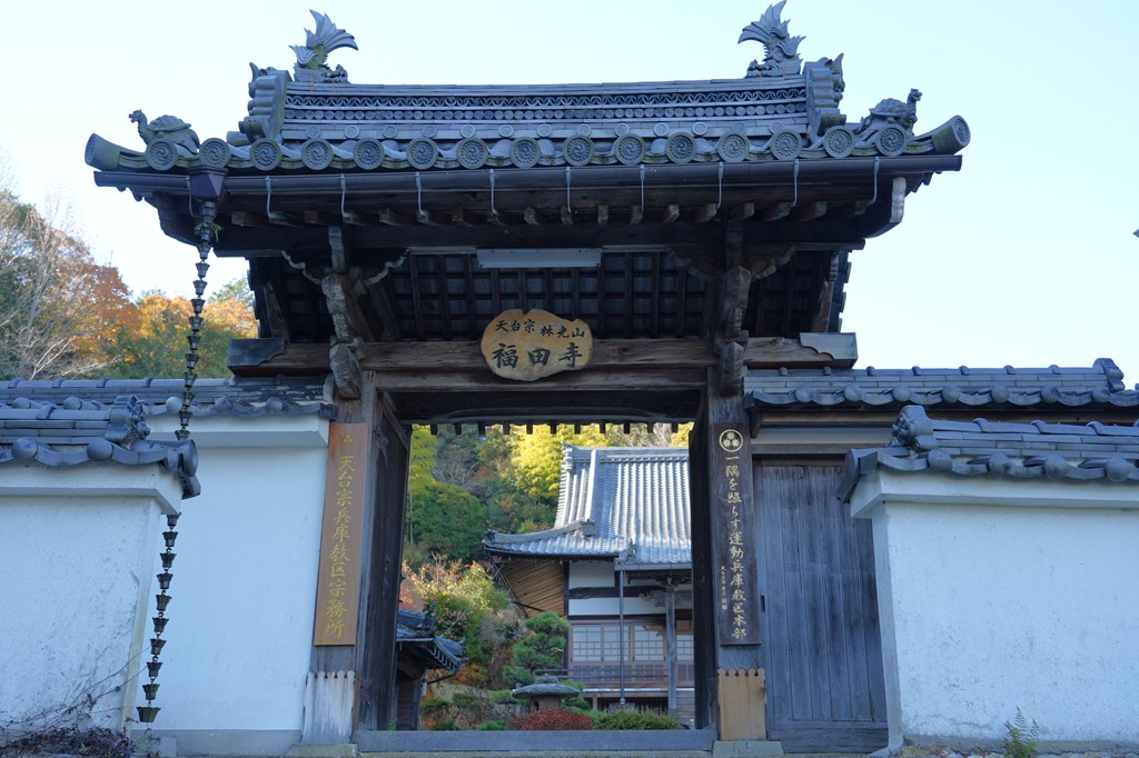 飛鳥時代の大化元年(645)、播磨国を中心にたくさんの寺院を創建した法道仙人によって開かれたと伝わる古刹。その後の慶長年間(1596~1615)、教順大阿闍梨により再興された。現在の本堂は、昭和11年(1936)に真道法印によって再建された建物である。明治6年(1873)には、現在の姫路市立山田小学校の前身の学校の一つである南山小学校が福田寺に設立された。